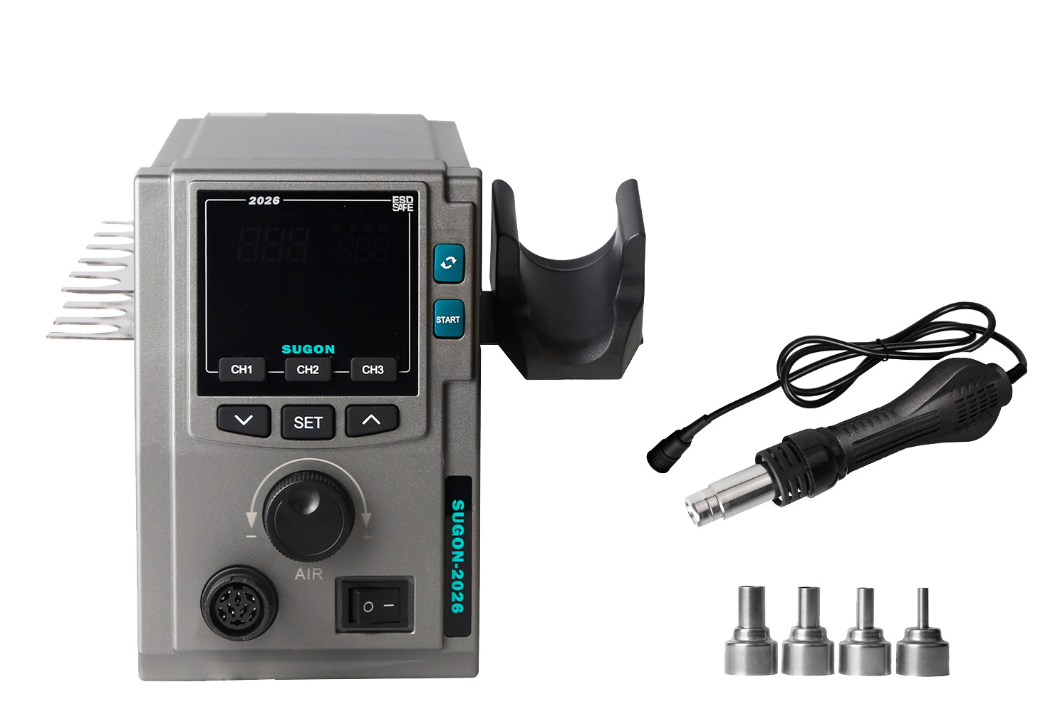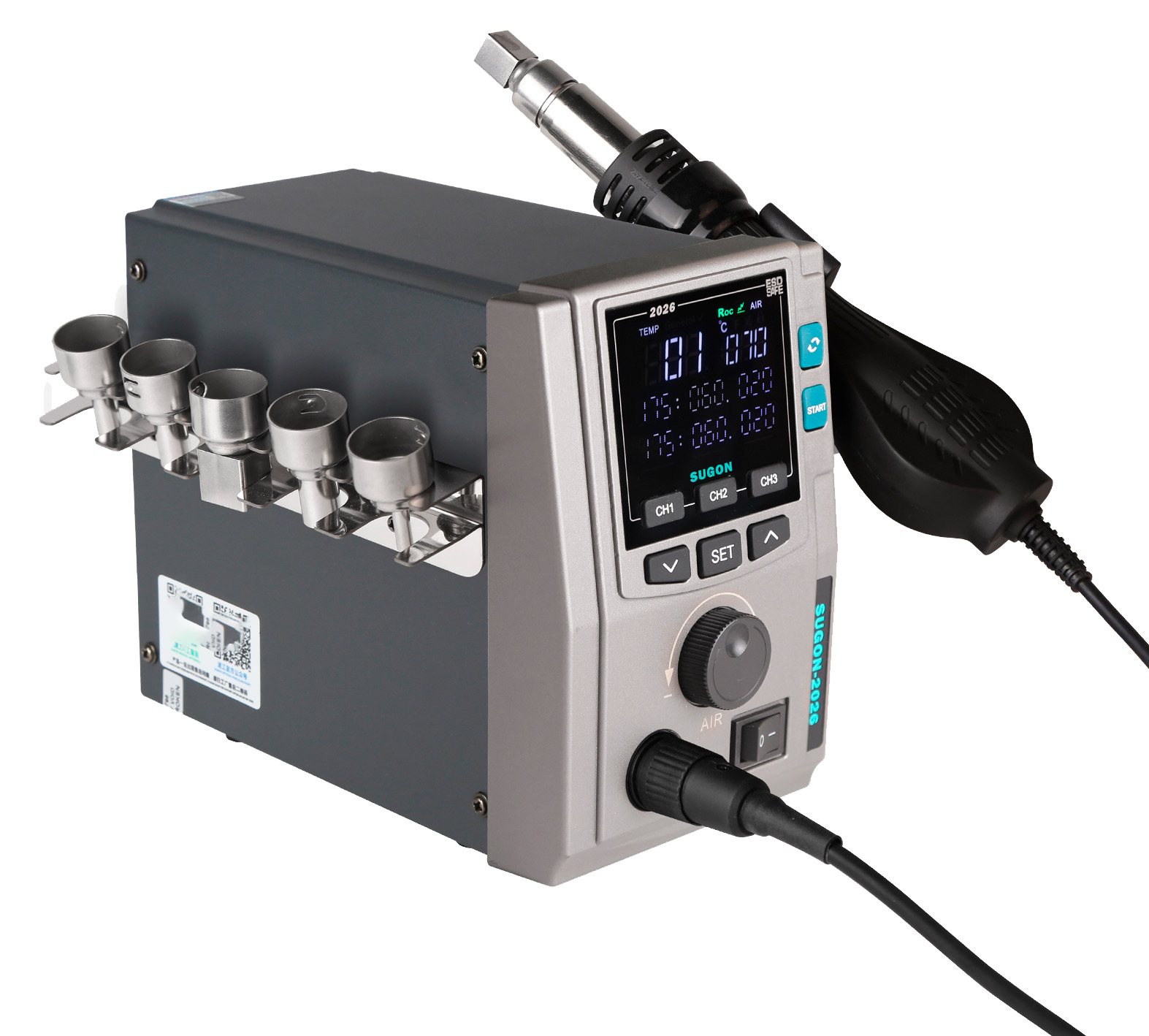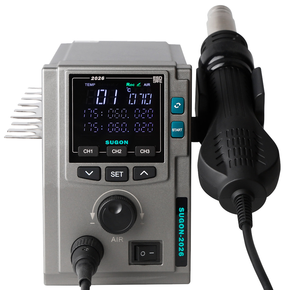 – A Sugon 2026 é uma estação de retrabalho BGA de alta potência (700W) com pistola de ar quente, ideal para soldagem e dessoldagem rápidas e precisas