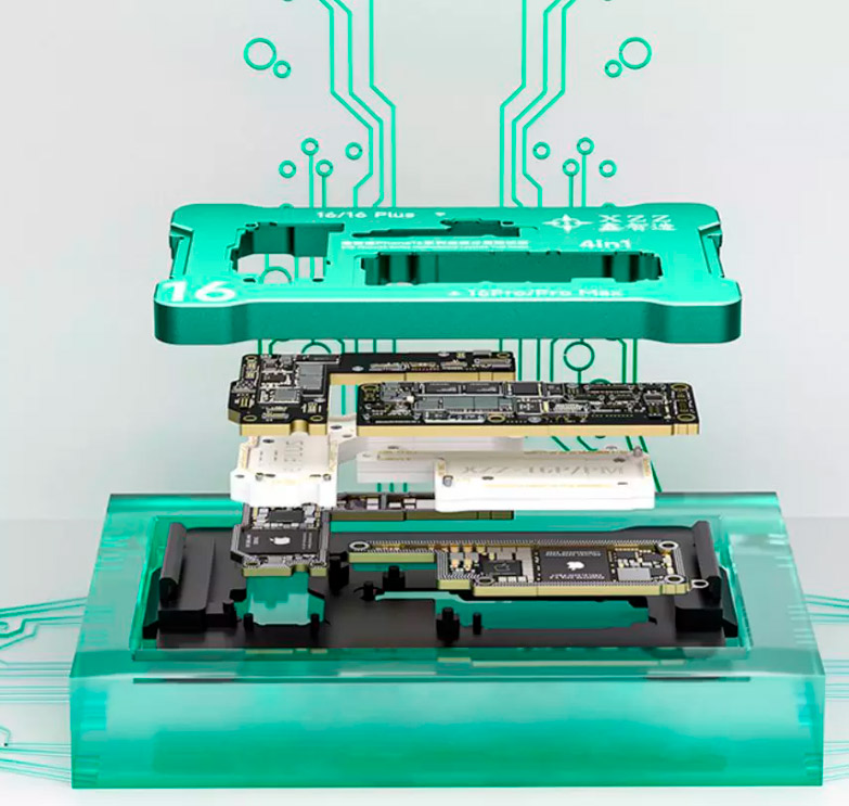• Plataforma de teste em camadas para conexão da placa-mãe superior e inferior do iPhone 16