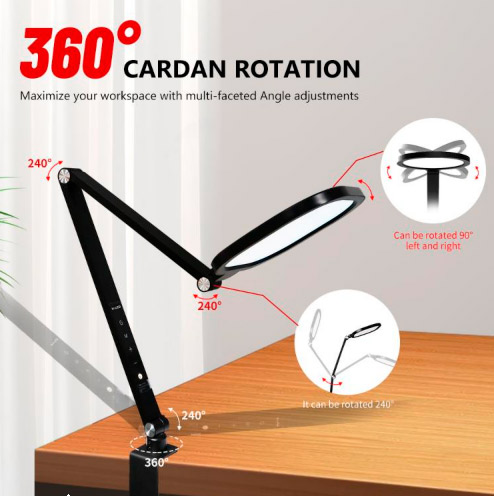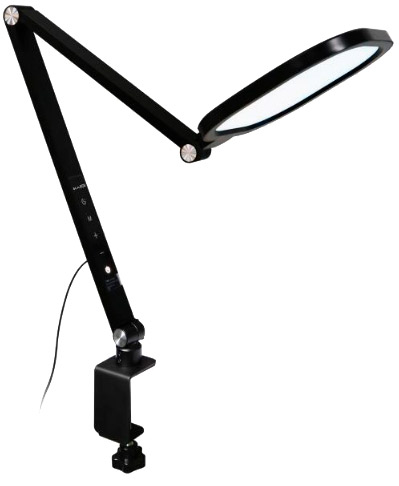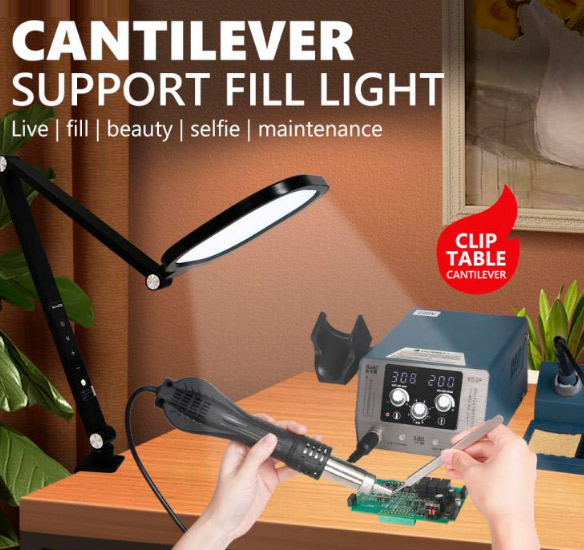 • Luminária de mesa com presilha tipo clip, ideal para bancadas de reparo eletrônico