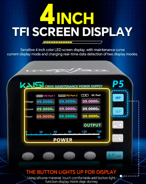 • Suporte aos modos CV (tensão constante) e CC (corrente constante) garantindo alimentação estável e controle preciso durante reparos